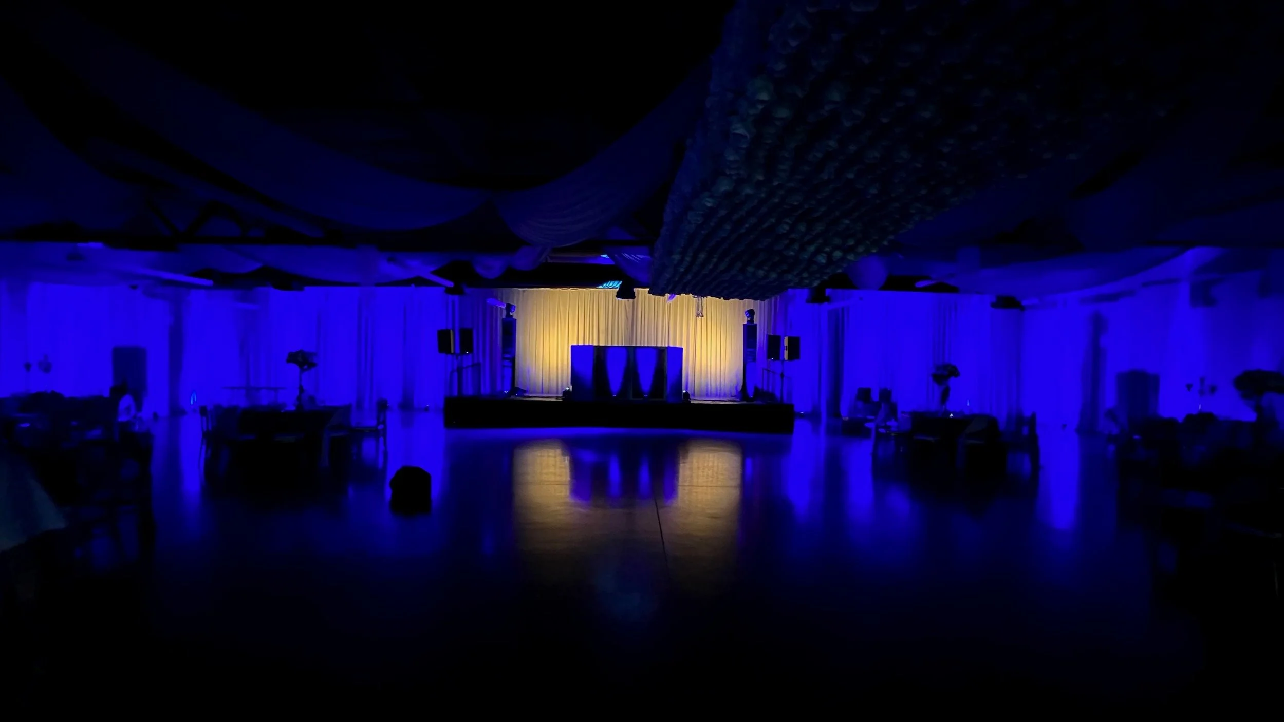Uplighting can bring any room to life. It can be set to match your decor and synchronized to enhance your party. It comes in every color you can imagine. We strategically set them all around the room to shoot colored light from the floor to the ceiling. We also set them to bounce light off of trees or anything in the background.